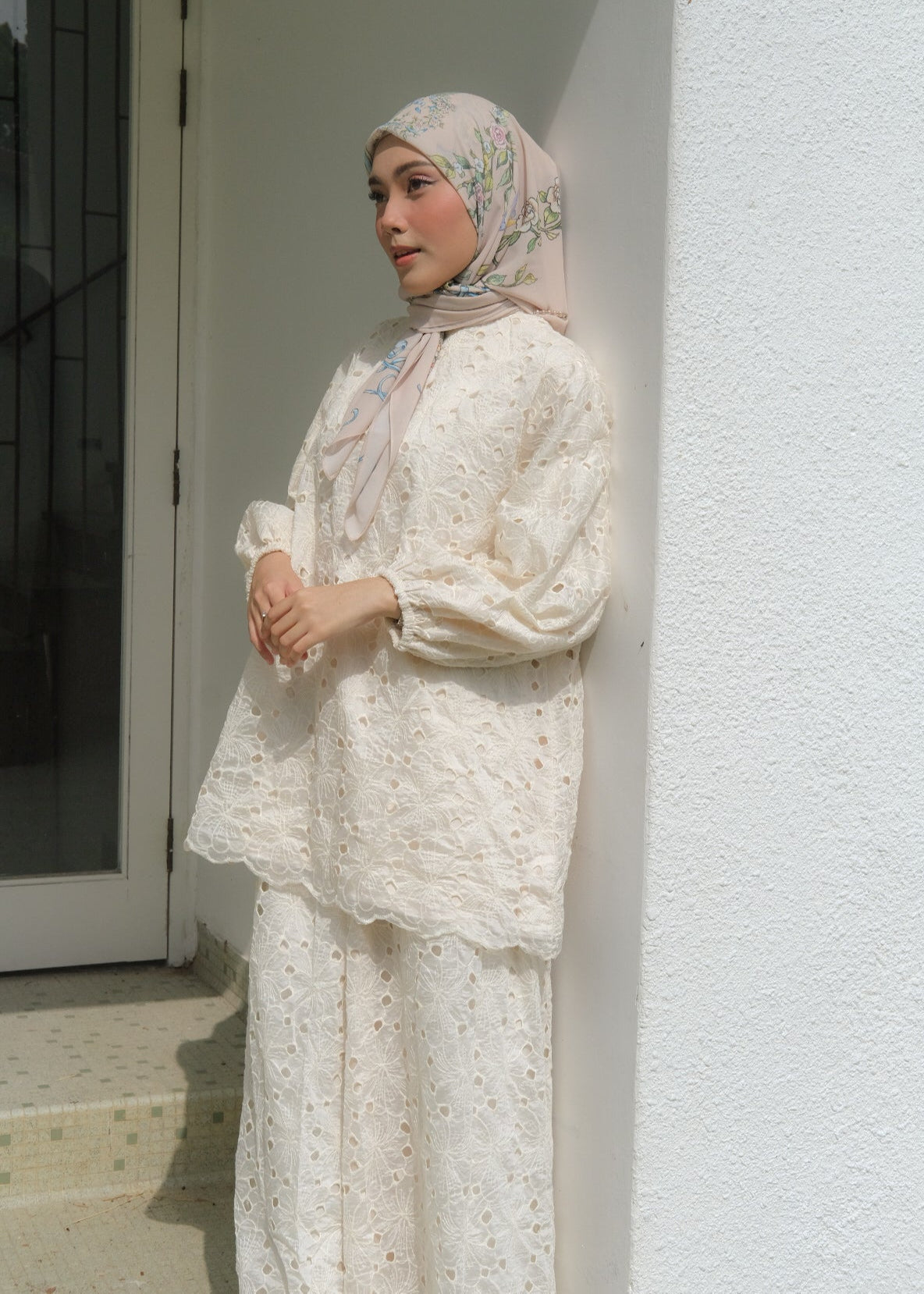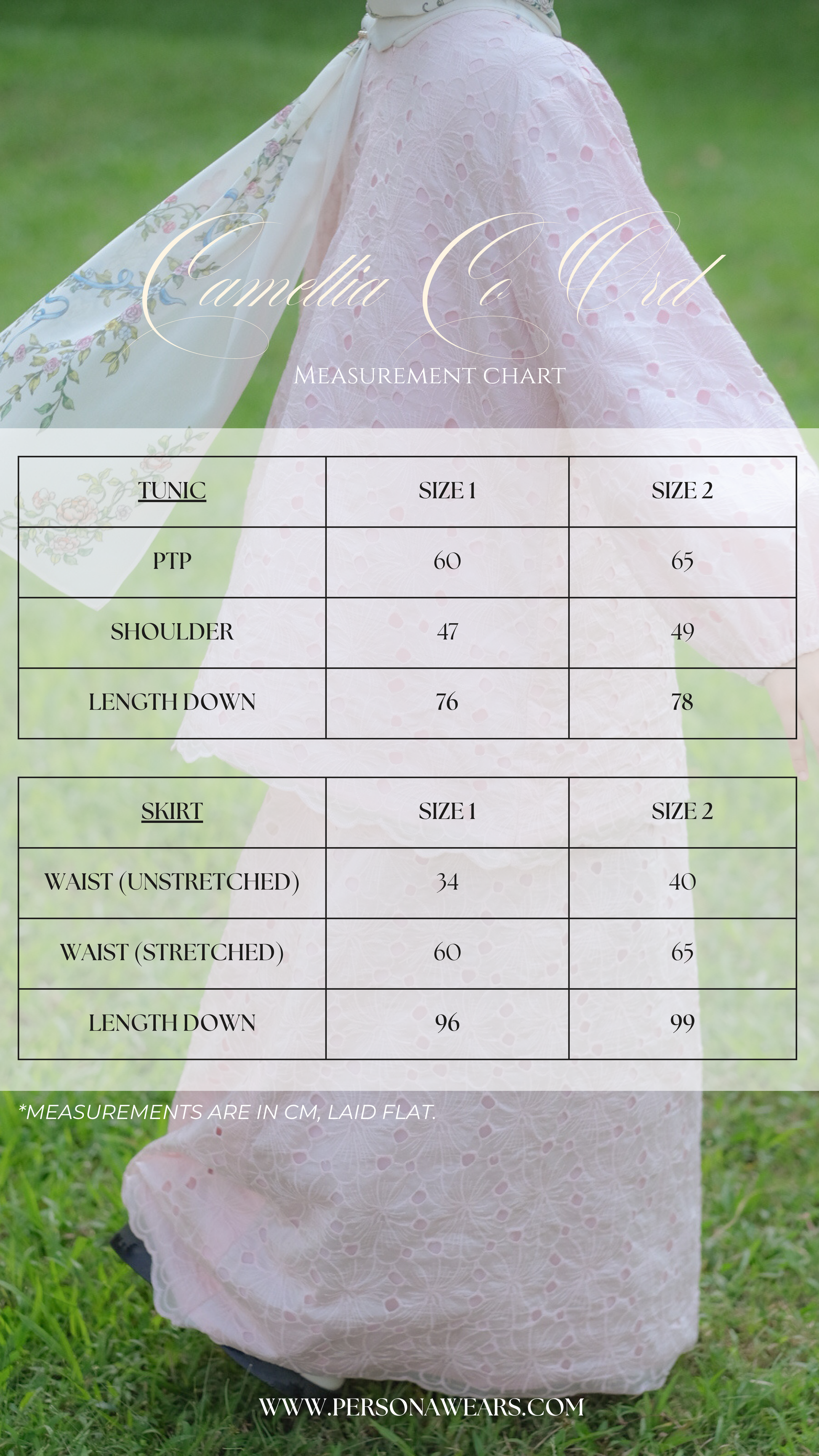 The Camellia Set is a two-piece tunic set crafted from delicate floral broderie in a soft cream tone. Designed with comfort and modesty in mind, the long tunic features a mandarin collar with a front zip closure and softly elasticated cuffs. It pairs with a relaxed A-line skirt, both pieces fully lined for ease of wear. Simple, graceful, and effortlessly gentle.